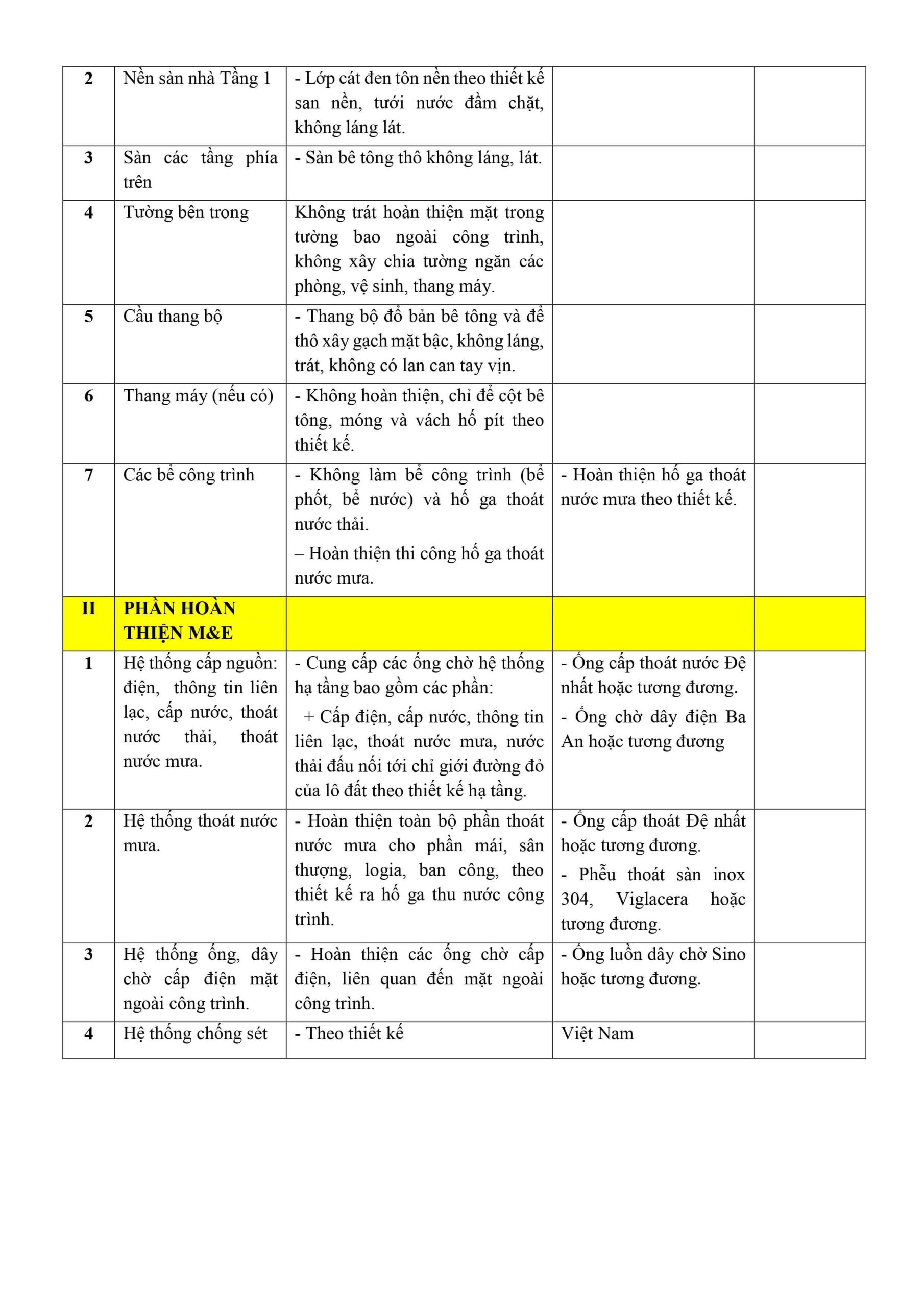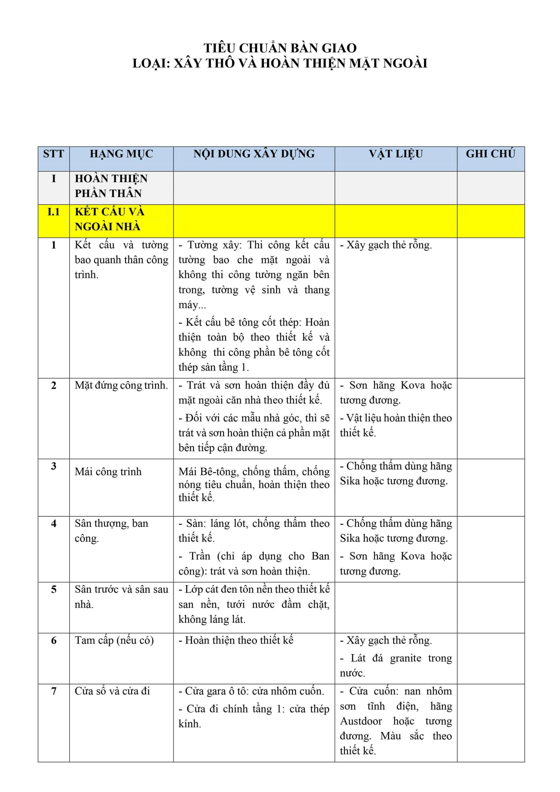 Danh mục vật liệu và trang thiết bị bàn giao T&T Tam Đa